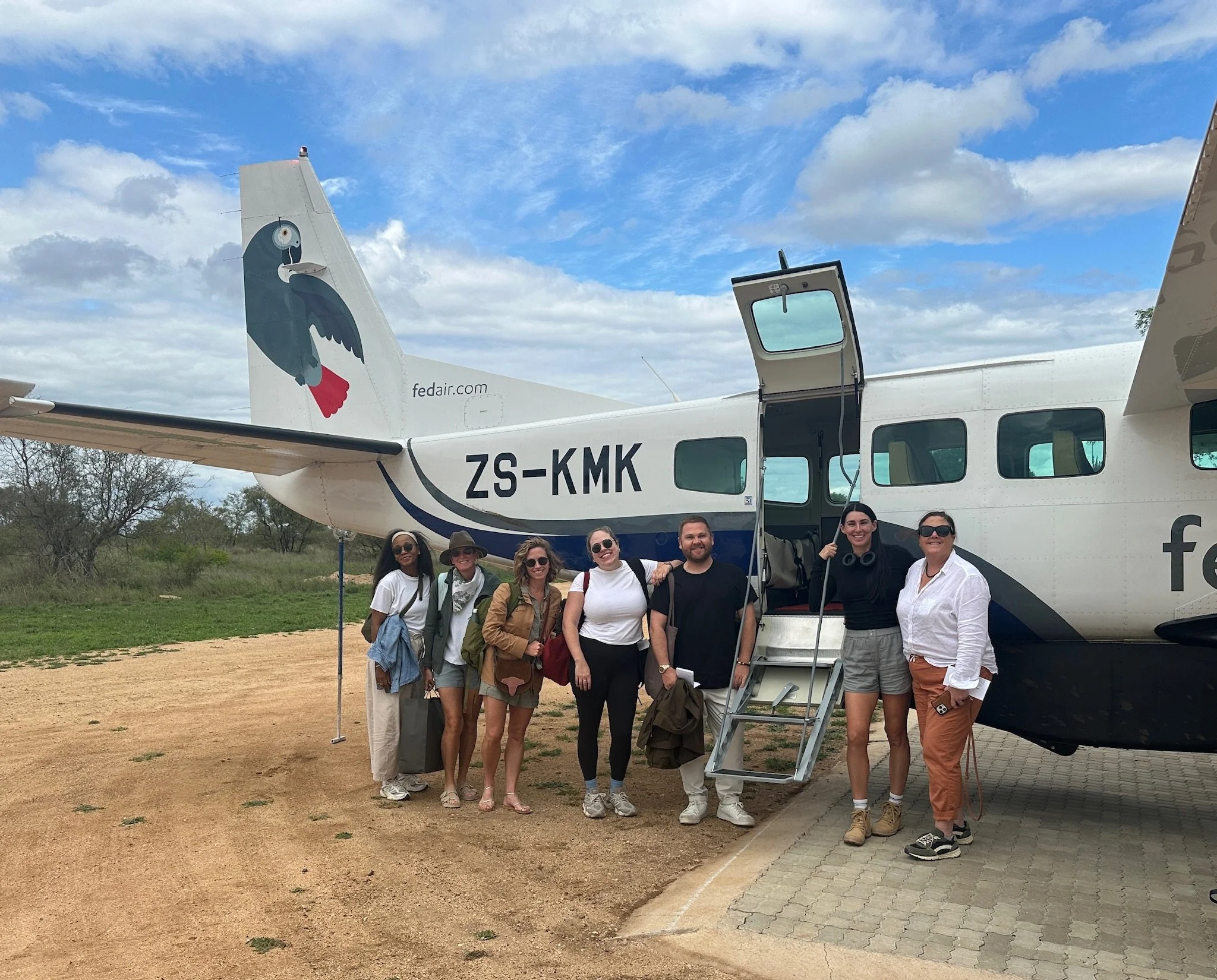 (L-R) Singita’s Pride Maunatlala, Local Foreigner’s Meg Nolan, Kate Mitchell, Alex Kramer, James McLaren, Alex Erdman Ely, and Maggie Ryan prepare to board their bush plane to the Sabi Sand